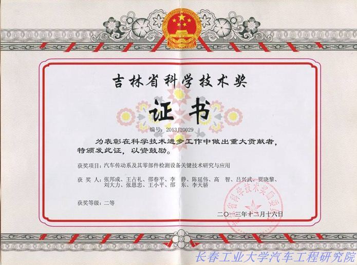 汽车传动系及其零部件检测设备关键技术研究与应用获奖证书