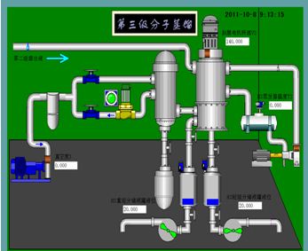 低能耗蒸馏技术及装置,是以低能耗为目标,将沸点差和分子蒸馏相结合,集成负压低温蒸发技术、热泵技术、旋转刮膜技术和自动控制技术,研制了低能耗蒸馏装置,达到了高效蒸发、高纯度提纯及节能降耗的目的。研究开发的低能耗蒸馏装置设计了旋转刮膜蒸发工艺,实现了低飞溅率的旋转刮膜自动控制;采用模糊解耦控制方法解决了蒸馏过程真空度和温度的强耦合关系的控制难题,降低了能耗;冷却系统结构优化及其控制技术的应用研究,提高了热能利用率,降低冷却水消耗量;研发了DCS控制系统及蒸馏过程最佳工况点优化及控制技术。